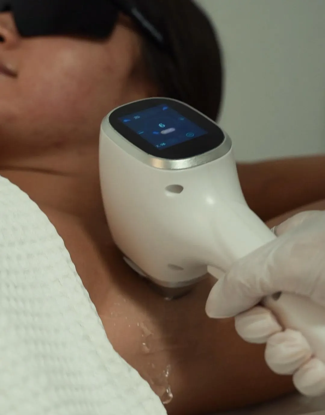 Ultraschallgel wird aufgetragen, um eine optimale Übertragung vom Gerät auf das behandelte Areal zu gewährleisten. Anschließend wird das Gerät auf die Haut gesetzt und die Intensität je nach Hauttyp und Bereich angepasst.